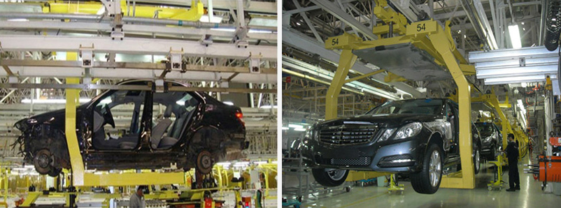 本項目是在北京奔馳現有的克萊斯勒汽車總裝車間整合設備,生產奔馳E級車和C級車。在地面高度新安裝ASD輸送線。使用空滑撬升降機將車身降到地面高度。空滑撬送入滾床,在0m時,通過鏈式移行機輸送到北側新的ASD輸送線。再通過移行機、滾床和升降機,把車身送入+3.3米的C型吊具中。車身在總裝滑撬上,完成操作后,車身向左或向右進入橫移保護工位(速度12min/min)。為了適應兩種車型的自動轉換。在線安裝支點自動轉換裝置,按照不同車型進行轉換。在底盤吊具和橇體上車身轉掛工位,設置舉升臺和浮動裝置,并經定位裝置進行準確定位,保證轉掛的準確性。車門線為了適應新車型,對所有支撐和安裝結構進行改造更新,保證車門線適應新車型的需要。