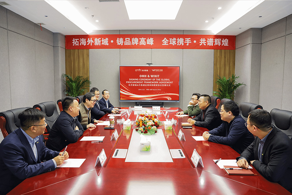 2024年11月22日,東杰智能&萬邑通全球采購框架協議簽署儀式在東杰智能總部成功舉行,合同總金額近7億元。儀式由東杰智能副總裁郭強忠主持,出席儀式的有:萬邑通董事長兼CEO陳宏偉、信息總經理徐國才,東杰智能董事長婁剛、總裁王振國、董事長助理陳晨、財務總監張路、副總裁劉鵬。此次協議的簽署,標志著雙方在全球物流領域的合作邁向新高度。